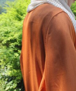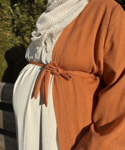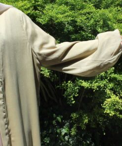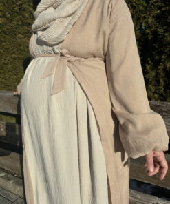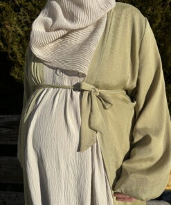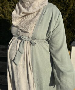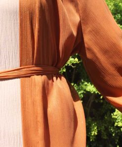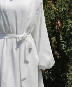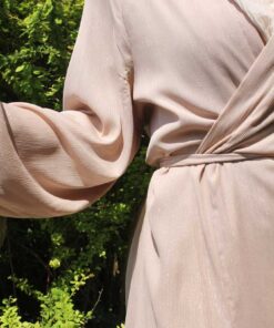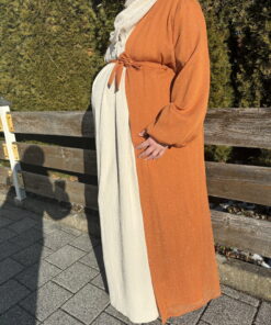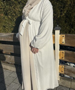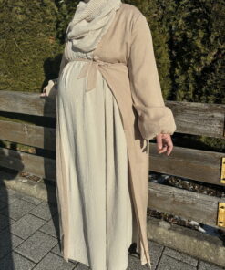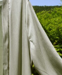 Ein langer, glitzernder Kimono mit schimmerndem Effekt, inklusive einem Gürtel zum Binden. Das Kleidungsstück ist gefüttert und verfügt über auffällige Ballonärmel, was für einen glamourösen Look sorgt.